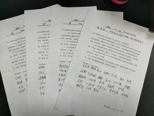 12月6日——15日,各班级以“诚信教育”为主题召开班会,各班主任结合历年作弊处分文件和学生手册,引导学生诚信考试,告知同学们考试违纪引发的不良后果。部分班主任还通过讲述“曾子杀猪”的故事,告诉大学生要在生活中践行诚信道德,切勿轻诺寡信,要一诺千金。同时,所有参加四六级考试的同学以班级为单位,签订考生诚信承诺书。