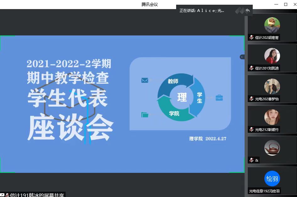 李扬说明了召开座谈会的目的与意义,希望同学们能畅所欲言,积极沟通,反映在学习、生活中存在的问题。各班学生代表发言,反映线上线下学习以及常态化疫情防控下的校园生活等有关问题。老师们针对问题予以说明、解答和指导,并及时反馈给学院。