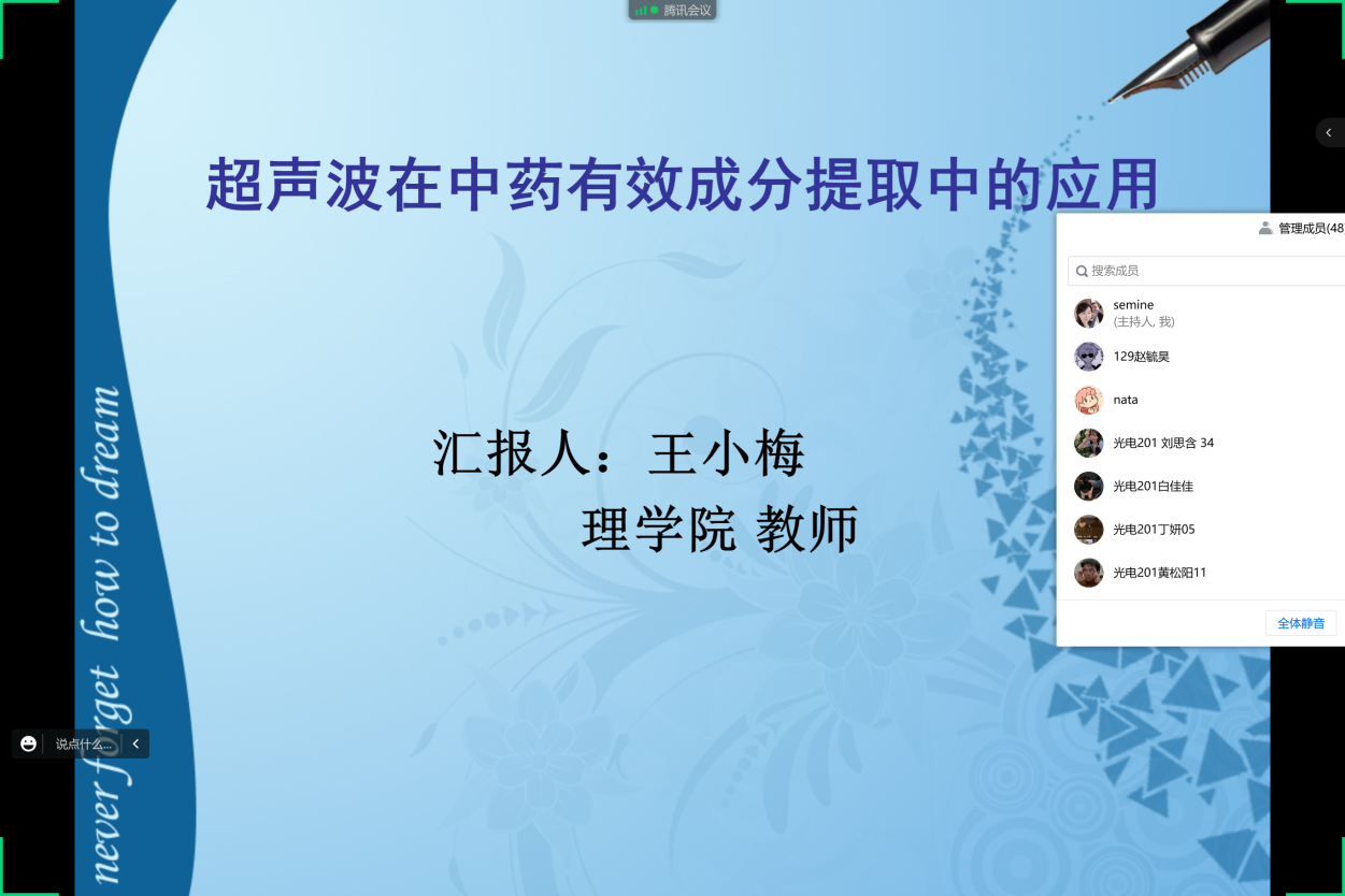 2022年9月17日,澳门网投官方网站在腾讯会议线上举办了“超声波在中药有效成分提取中的应用”学术讲座,此次讲座由物理教研室主任王小梅主讲。