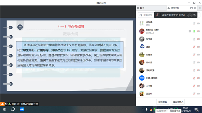金发成首先介绍了召开本次研讨会的主要内容和目的。随后,光电信息科学与工程专业负责人王妙老师从工程认证和专业认证视角下强调了课程教学大纲的重要性,介绍了制订课程教学大纲的指导思想、制订原则和大纲框架等。并结合本专业人才培养方案详细地讲解了2023版课程教学大纲的设计要点、基于OBE理念的课程大纲编写流程与案例、课程思政元素的融入、课程目标达成评价机制与毕业要求达成评价机制的构建等内容。参会人员就大纲的撰写过程遇到的共性问题进行了深入探讨,厘清了基于OBE理念的教学大纲撰写思路,找到了解决共性问题的方法,对进一步推进教学大纲修订与编制工作起到积极的引导作用。