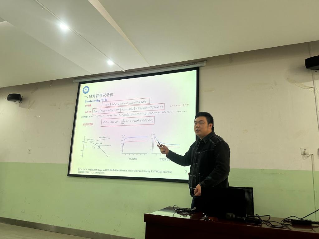 张明,理学博士,研究领域为引力理论,黑洞物理学,长期从事修改引力背景下黑洞解的构造、热力学、相变、似正规模以及高维时空黑洞解及其热辐射性质等研究。同伦分析法是一个求解非线性方程(组)解析近似解的有效而可靠的方法,本次报告,他以“同伦分析法在黑洞解中的应用”为题,介绍了一个模型Einstein–Maxwell–Weyl黑洞,并利用同伦分析法求解了该模型的解析近似解,同时与其数值解做对比分析了解的优越性。报告结束后师生们对讲座内容进行了热烈的学术探讨和交流。