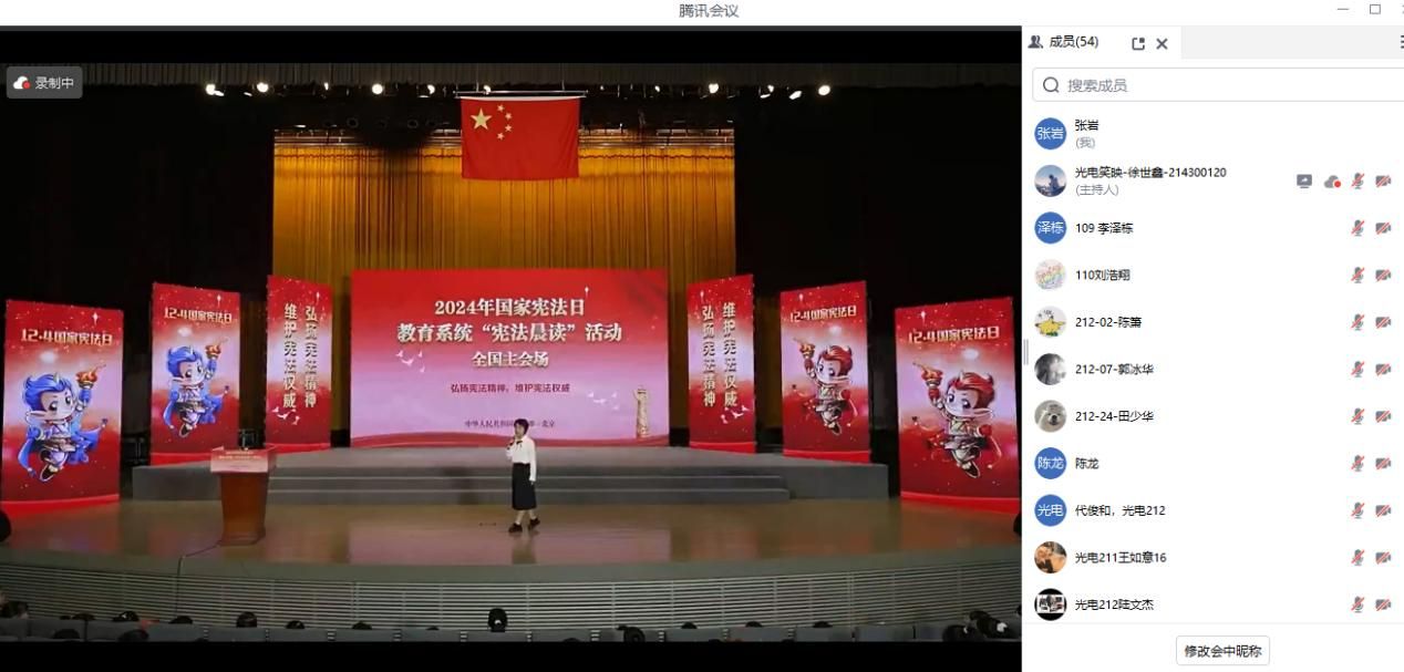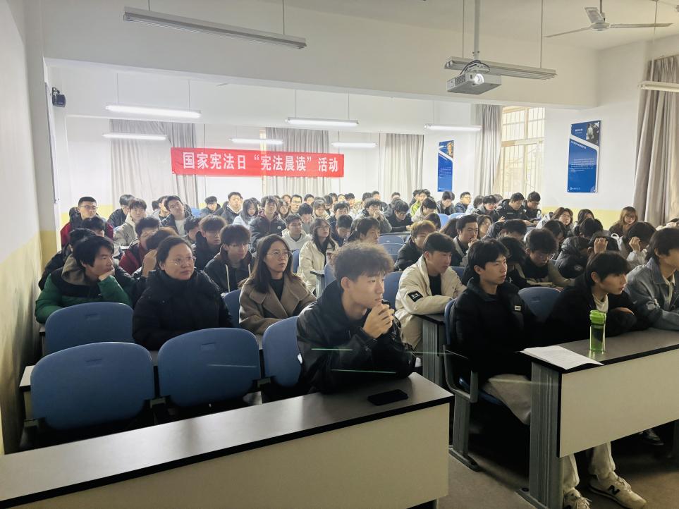 集中观看国家宪法日教育系统“宪法晨读”活动直播。大屏幕上,清晰的画面传递着庄严肃穆的场景,每一个字、每一句话都仿佛有千斤之重,彰显出宪法崇高的地位和无比的权威。观看过程中,同学们不时地低声交流,分享着对宪法条文的感悟,交流着对宪法精神的理解。