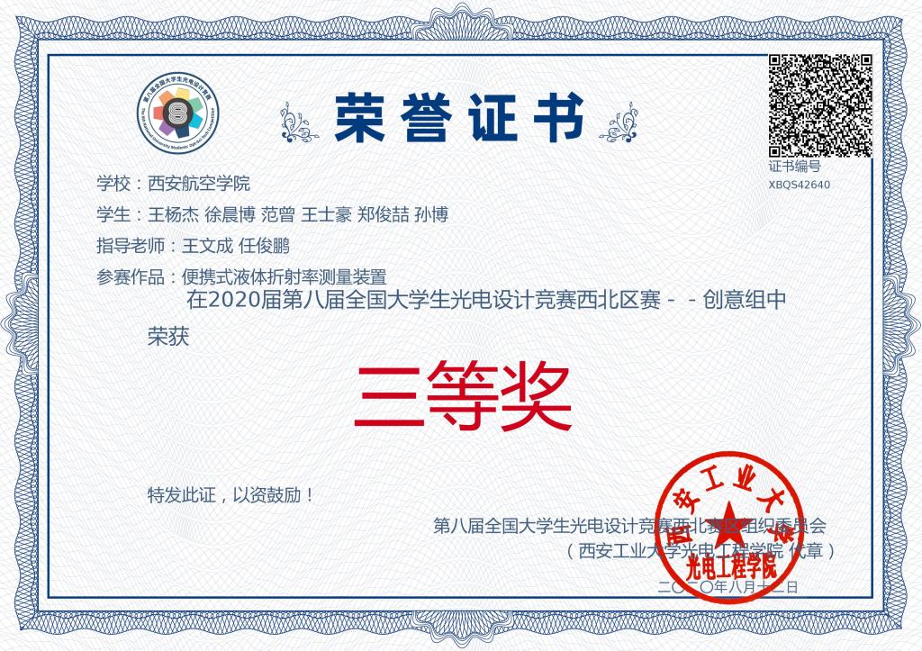 2020年8月10日,第八届全国大学生光电设计竞赛(西北赛区)在西安工业大学落下帷幕,共有来自西安交通大学、西北工业大学、西安电子科技大学、兰州理工大学、宁夏大学等西北五省16所高校的141支队伍报名参赛。澳门网投官网是首次参加该项全国性光电竞赛。经过线上评审初赛,共有57支参赛队伍获得路演决赛资格,澳门网投官网澳门网投官方网站王文成、任俊鹏老师指导光电信息科学与工程专业6名本科生组成的“追梦”团队荣获西北赛区三等奖。