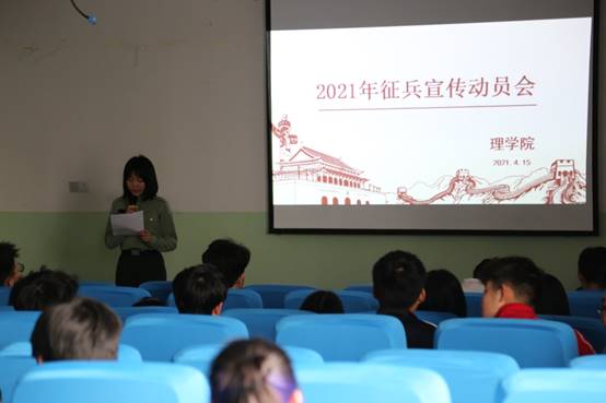 2021年4月15日星期四下午五点,澳门网投官方网站在北楼441报告厅举办主题为“优秀青年立志从军,热血男儿精诚报国”的2021年征兵宣传动员会。澳门网投官方网站学生管理科科长李扬、辅导员张岩、大三全体学生和有意向参军入伍的同学参加了会议,会议由张岩主持。