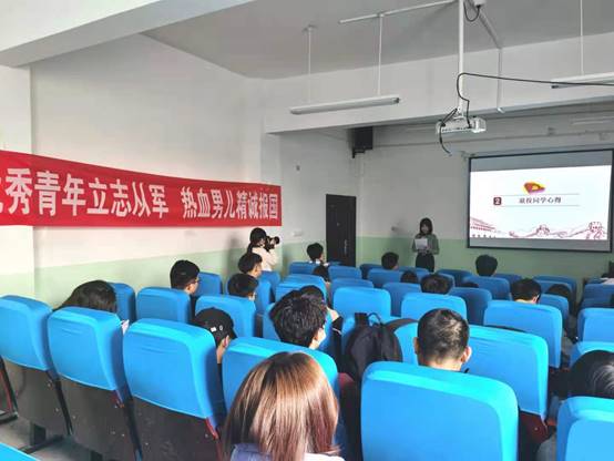 活动伊始,大家集体观看了本年度秋季征兵宣传片;接着信息计算201班退役复学的同学王语婷分享了她在军营生活的经历和她最喜欢的那句话,即电视剧《火蓝刀锋》的主角蒋小鱼所说的“我愿将每一滴热血洒进祖国的大海”,同时,她讲出了退役时候给部队的庄严承诺:若有战,召必回,战必胜,表现出了一名军人对祖国最深切的爱,在场响起了热烈的掌声;随后,信息计算181退役复学的张永航向同学们展示了自己的军营生活,讲解了国家对大学生参军的相关政策,即退役士兵考研会额外加10分,并且在2018年开始实行了军属保障政策,军属军医院看病可以享受几乎全免的政策,在军队中提干关于大学生的一些福利政策等相关内容。