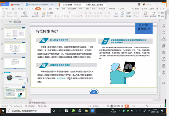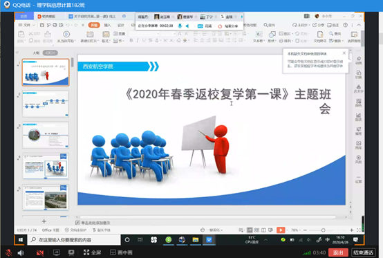 为助力春季学生平安返校,按照学校要求,澳门网投官方网站各班级在4月21日至5月5日期间,分别召开了《2020年春季返校复学第一课》线上主题班会。班会由各班主任主持。