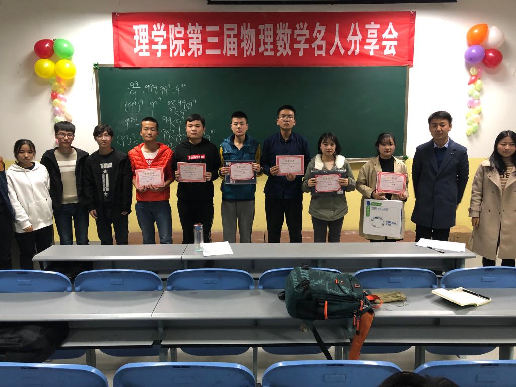 11月28号,澳门网投官方网站举办的第三届“物理数学名人分享会”决赛在南楼408教室举行。到会的有澳门网投官方网站辅导员杨陈东、张小妹、班主任王妙、李小雪、团学干部及大一大二全体学生。