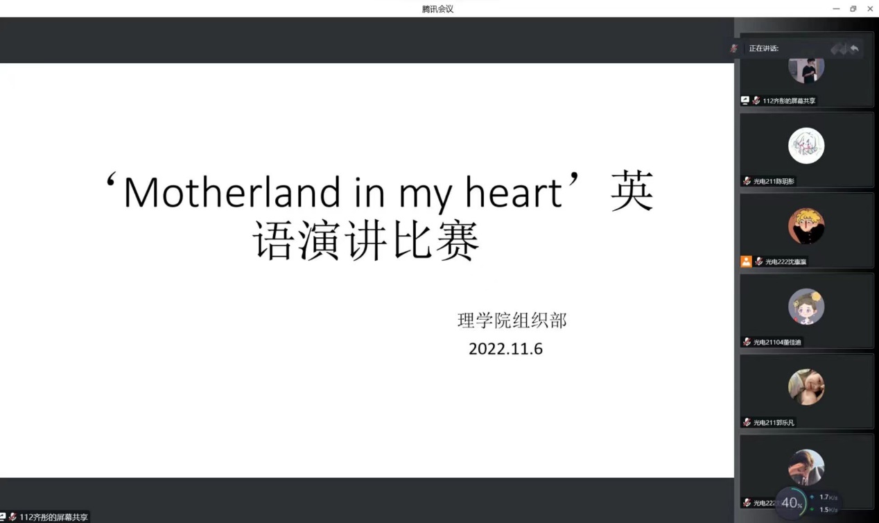 为提高学生英语演讲水平,丰富同学们的课余生活,激发同学们的学习热情,2022年11月6日,澳门网投官方网站以线上形式组织了以‘The motherland in my heart’为主题的英语演讲比赛,澳门网投官方网站大一大二13名同学参加,活动由沈惠瀛主持。