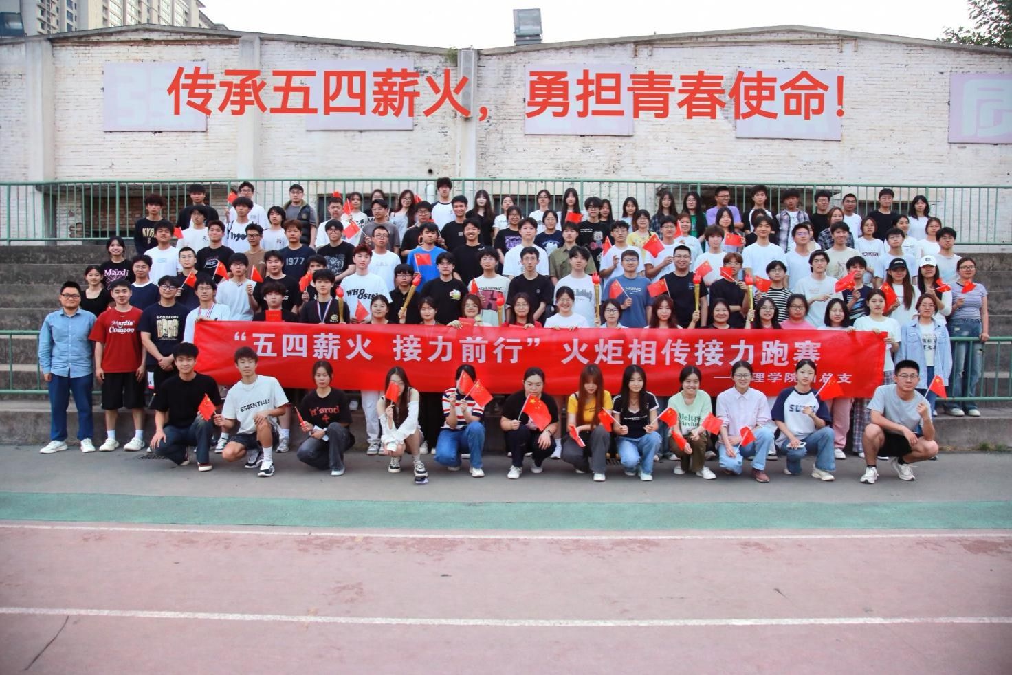本次接力跑赛在本部操场进行,赛道全程精心规划,设置了多个接力点。参赛选手分成若干小组,每组队员紧握象征五四薪火的火炬,奋力奔跑。赛场上,选手们步伐矫健、斗志昂扬,你追我赶,将个人速度与团队协作完美结合。每一次火炬交接,凝聚着团队的信任与期待;每一次冲刺,彰显着青春的激情与活力。当火炬点亮夜空,当誓言声响彻云霄,我们不仅见证了这场跨越时空的精神传承,更触摸到新时代团员青年奔赴山海、逐梦未来的壮志豪情。