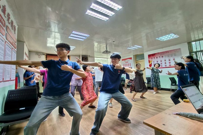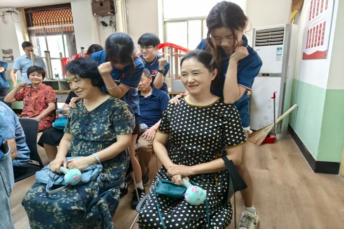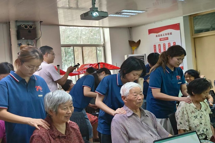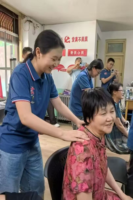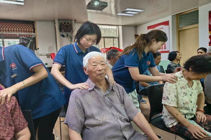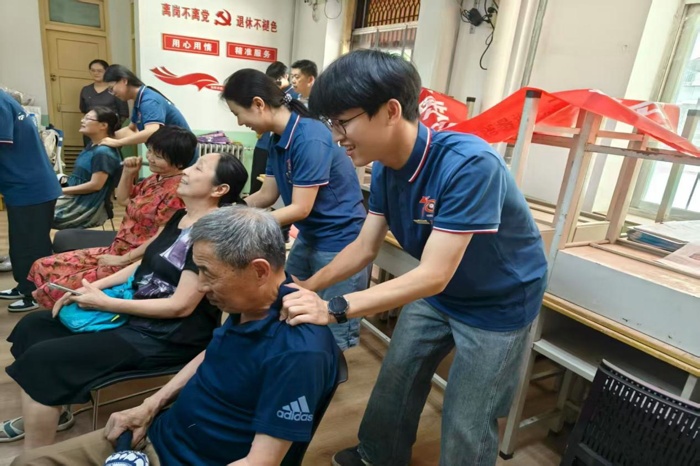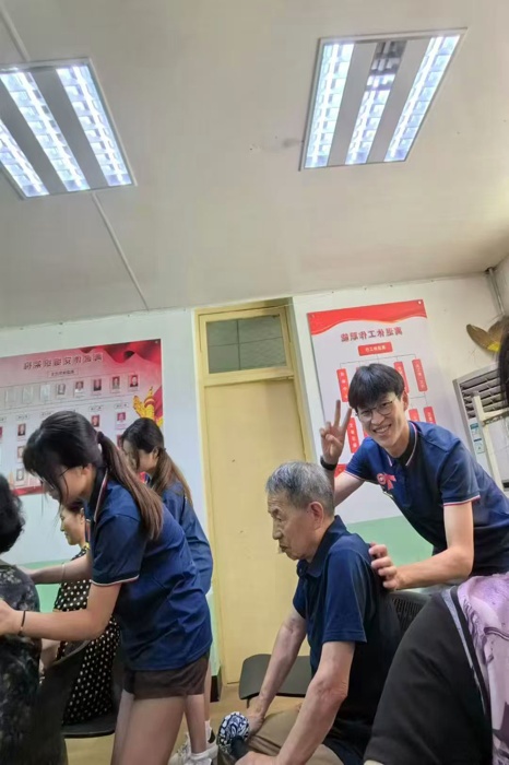 知识宣讲后,活动进入互动实践环节。在雒同学的示范和指导下,老教师们兴致盎然地学习自主按摩手法。实践队员们则化身“健康小助手”,一对一地辅助老教师们掌握要领,并运用所学技能,轻柔地为老教师们进行肩颈放松按摩,缓解日常疲劳。现场气氛温馨融洽,老教师们切实感受到来自后辈的关怀与温暖。随后,在舒缓音乐的陪伴下,闫同学和程同学带领队员与老教师们一同习练传统养生功法八段锦。一招一式,不仅弘扬了中华优秀养生文化,也有助于老教师们舒展筋骨、调和气血,现场暖意融融。