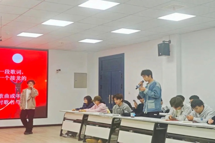 歌会内容丰富多彩,节奏紧凑。趣味游戏环节将现场气氛推向高潮。“歌曲接龙”考验同学们的反应速度与歌曲储备,大家积极抢答,现场笑声与欢呼声不断。“听歌识曲”环节中,熟悉旋律刚一响起,同学们便踊跃举手,精准报出歌曲名称,在互动中重温经典。