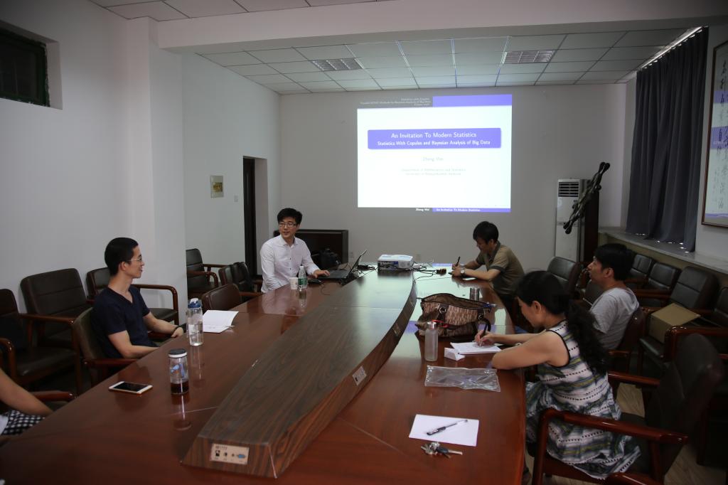 魏征教授从基于copulas的统计和大数据的贝叶斯分析两个方面对现代统计分析做了介绍,同澳门网投官网教师在copulas应用以及大数据处理分析等方面进行了充分讨论交流。魏征教授对澳门网投官方网站信息与计算科学专业的大数据方向及教师的大数据团队的搭建给出了中肯的建议,并表示可以在后续大数据科研和教学工作中进一步加强合作和交流。