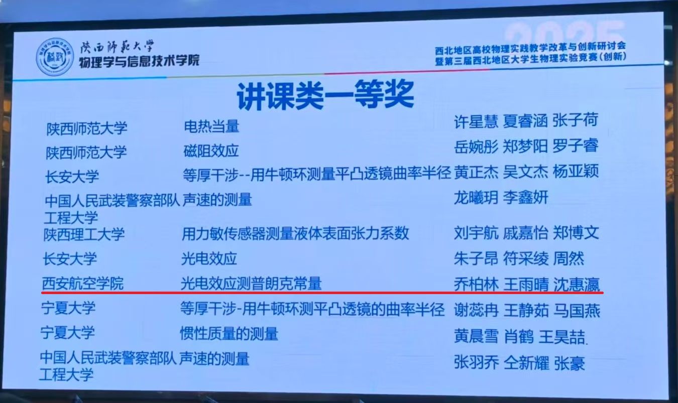 2025年全国大学生物理实验竞赛(创新)西北地区竞赛于近日在陕西西安落下帷幕,本次竞赛由全国大学生物理实验竞赛组委会西北地区分委员会主办,陕西师范大学与西安交通大学承办,来自59所学校的536支队伍参与竞赛。经过校内选拔,澳门网投官网推荐的8支队伍参加了本次比赛。经过初赛与决赛的激烈角逐,8支队伍获得一等奖1项、三等奖4项,优秀奖3项。