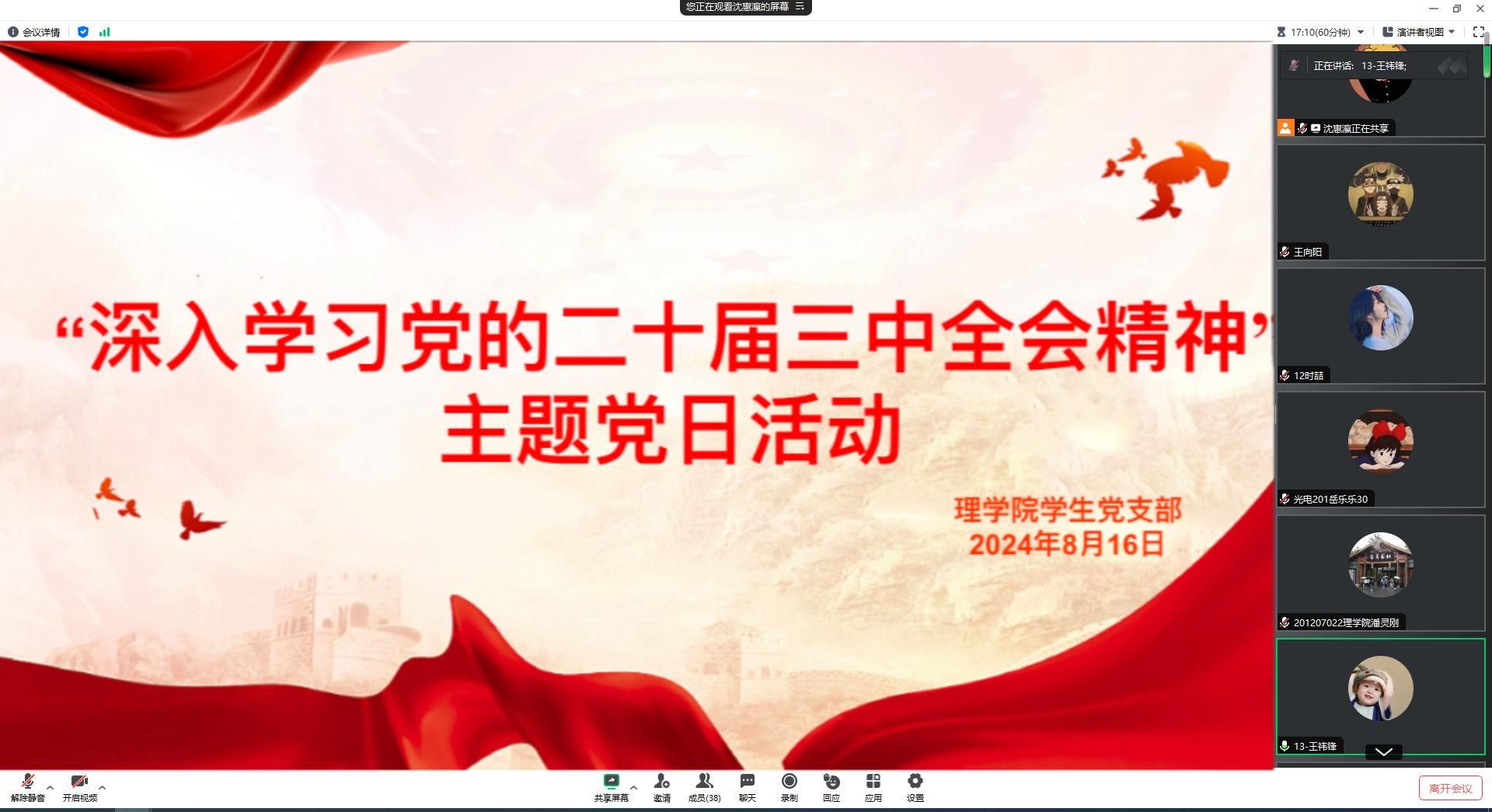 为深入学习宣传和贯彻落实党的二十届三中全会精神,2024年8月16日,澳门网投官方网站学生党支部于线上开展“深入学习党的二十届三中全会精神”主题党日活动。活动由支部书记李扬主持并领学,教师党员王向阳、曾妍、张岩以及支部全体学生党员参加本次学习。