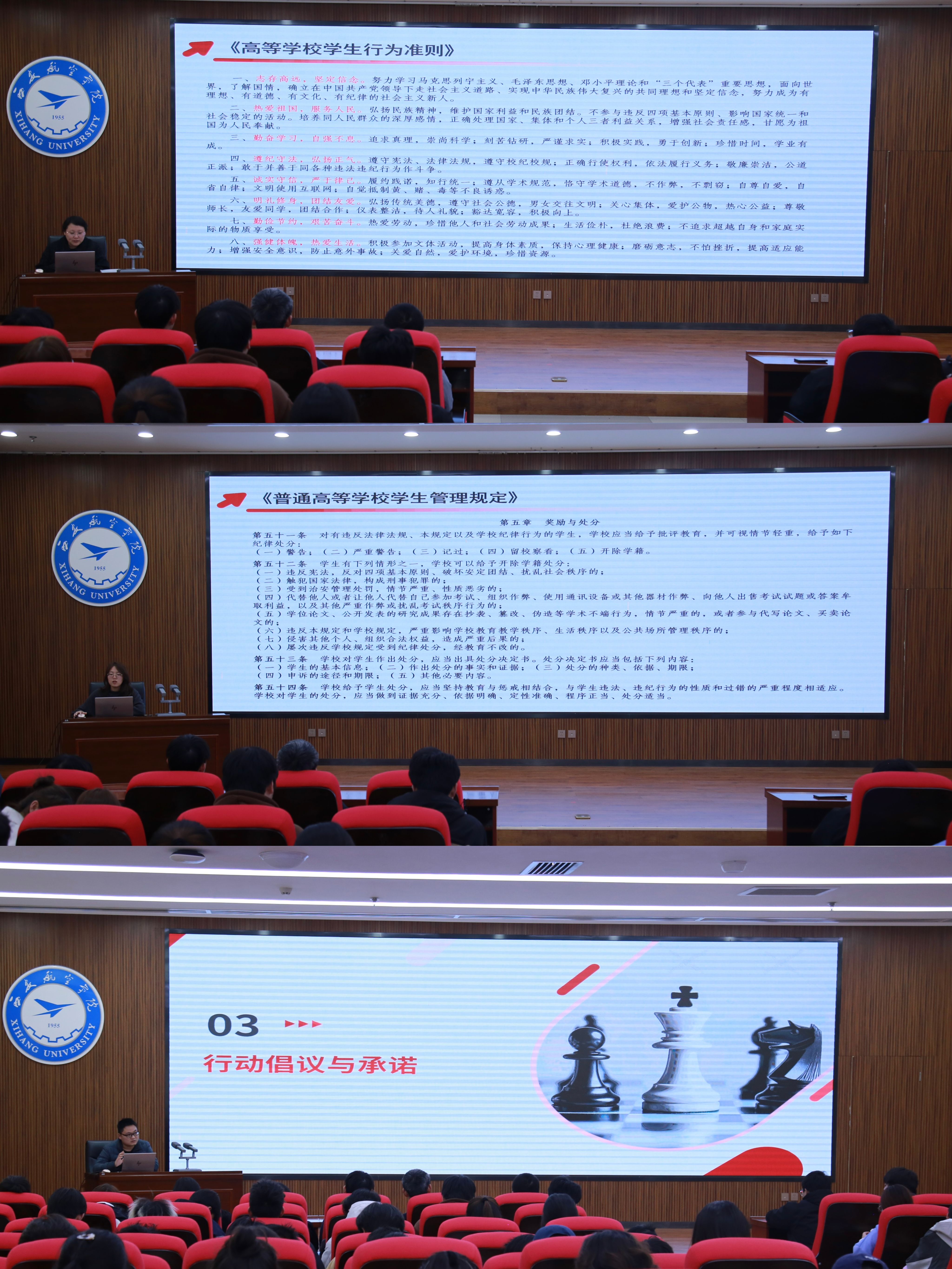 本次学习教育活动主要包括四个方面的内容:一是重点学习《中华人民共和国国家安全法》《中华人民共和国网络安全法》等法律法规有关条款,旨在使全体学生进一步明确应当履行的维护国家安全、荣誉和利益的义务,从而自觉防范和抵制不当的网络行为、非法宗教活动等危害国家安全的行为。二是重点学习《中华人民共和国学位法》《普通高等学校学生管理规定》《国家教育考试违规处理办法》《澳门网投官方网站学生考试违规处理办法(修订)》等有关内容,旨在使全体学生进一步认识严肃学风考风的重要性和必要性,从而强化诚信意识和学术道德。三是重点学习《高等学校学生行为准则》《澳门网投官方网站学生行为规范》等,旨在引导全体学生在日常学习生活中形成良好的道德品质,养成文明行为习惯。四是通过案例进行警示教育。通过剖析近年来发生在高校学生中的典型案例,使全体学生深刻认识违法违规违纪行为的严重危害和后果。