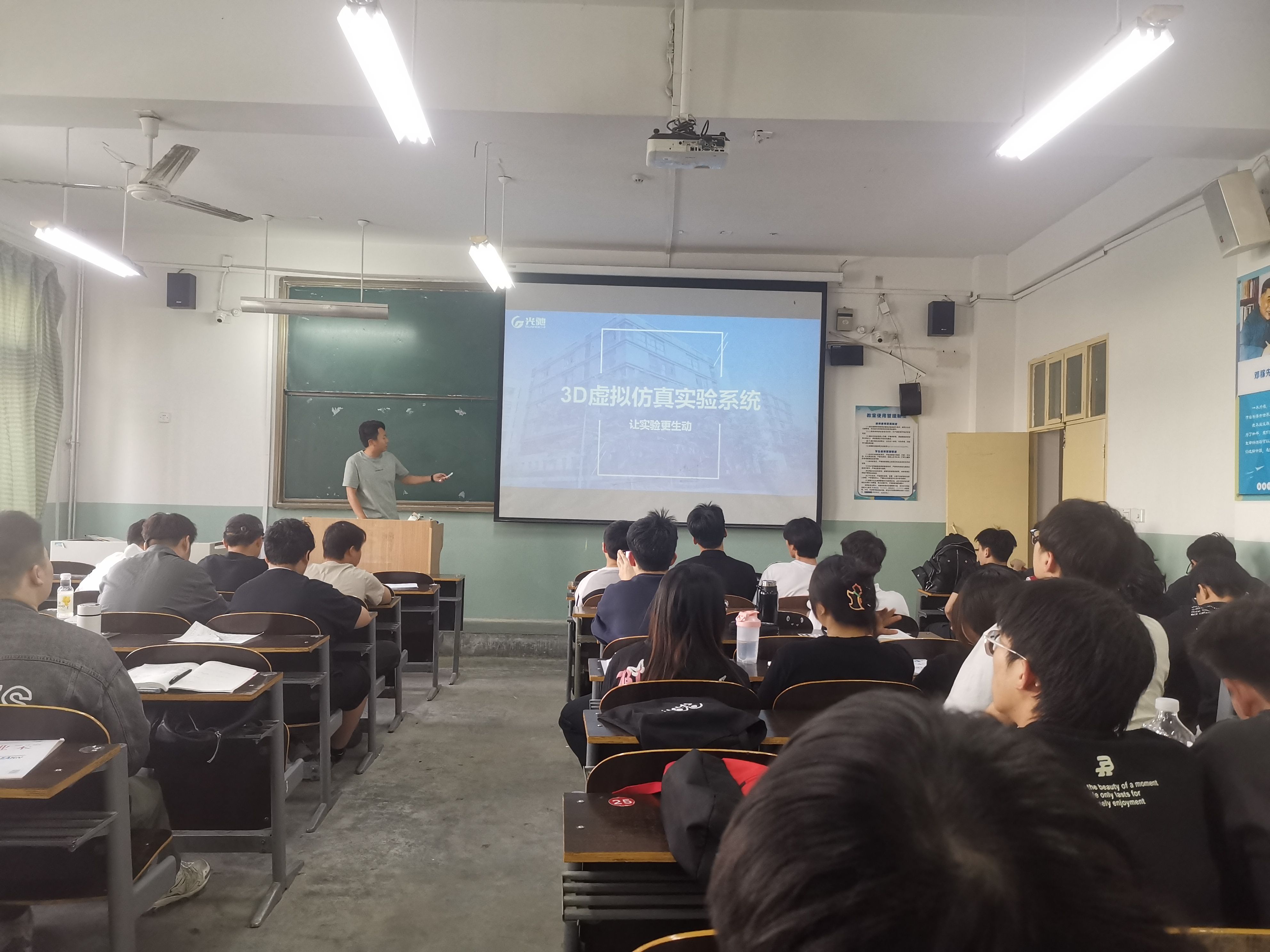 会后,胡经理面向光电信息专业大三年级的学生深入讲授了《3D虚拟仿真实验系统》相关内容,他结合自身深厚的行业经验和生动案例,深入浅出地阐释了系统原理与操作要点。学生们全神贯注听讲,踊跃提问。学生们对课程内容兴趣浓厚,纷纷表示这堂课拓宽了专业视野,对3D虚拟仿真技术有了直观且深刻的认知,为后续专业学习提供了新思路。